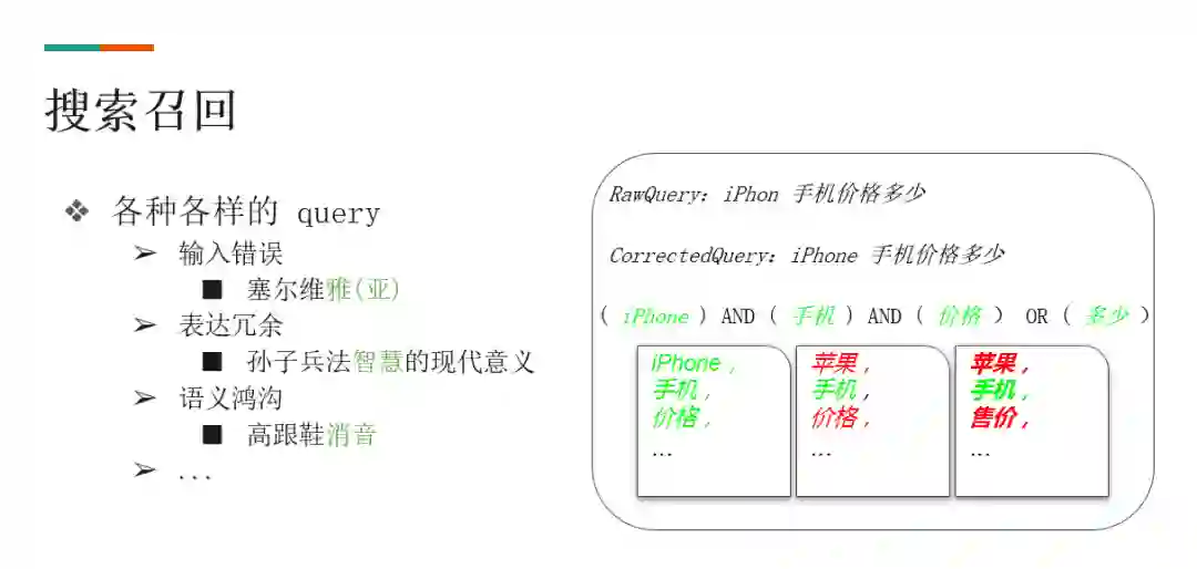 ❸ 解决语义鸿沟的问题。需要对原始 query 做同义词扩展,比如 "iPhone" 和 "苹果" 是同义词,"价格" 和 "售价" 是同义词。