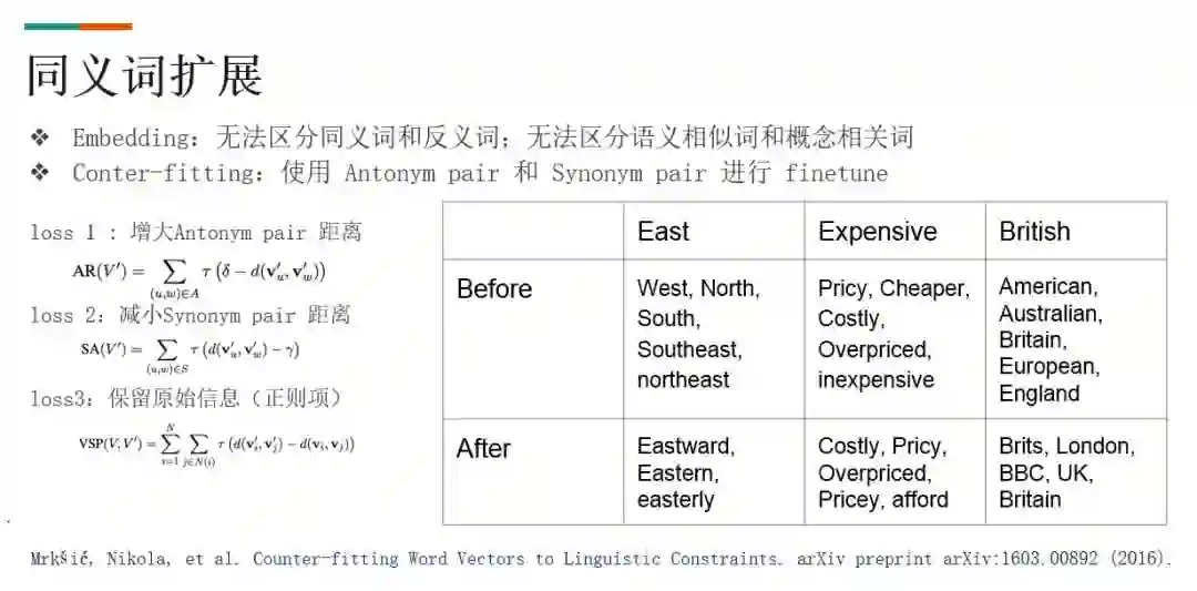 Word2vec 这一类的 embedding 计算方法,核心假设是拥有相似上下文的词相似。需要注意该方法无法区分同义词和反义词/同位词,例如最大/最小,苹果/香蕉。我们这里利用监督学习的信号,对训练完成的词向量空间进行微调。