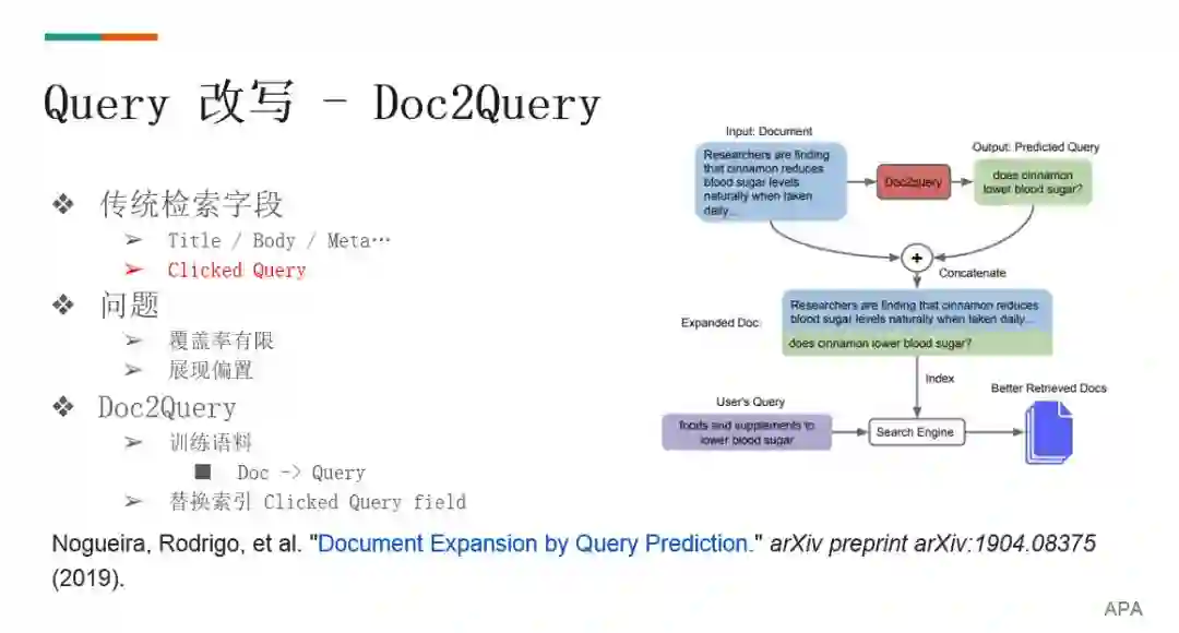 在改写中我们还训练了从 title 到 query 的模型,解决了检索中的重要字段 clicked query 的覆盖率有限和展现偏置两个问题。Clicked query 字段是记录点击过这个文档的 query,就是说尽管这个 doc 不含 query 里的词,但如果有别的用户搜了类似的 query 所点击的 doc,也会将其召回。