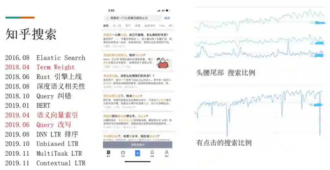 从我们内部实际数据来看,近一年知乎搜索的长尾化趋势也越来越明显。如上图右上部分是头腰尾部搜索比例,可以看到长尾 query 增长趋势明显。但在我们搜索团队的努力下,用户的搜索满意度并没有随着 query 难度的增加而下降。
