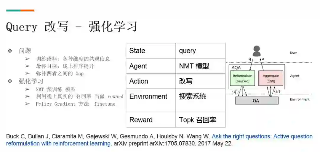具体来说,改写模型是拿共现数据做训练语料,但不能保证改写出来的结果一定可以召回有用的文档。我们参考了谷歌 2018 ICLR 的工作,为了将用户输入的 query 改写为更容易检索出答案的 query,把 QA 系统当做一个 environment,改写模型当做 agent,CNN 是对所有召回结果做选择的模块。