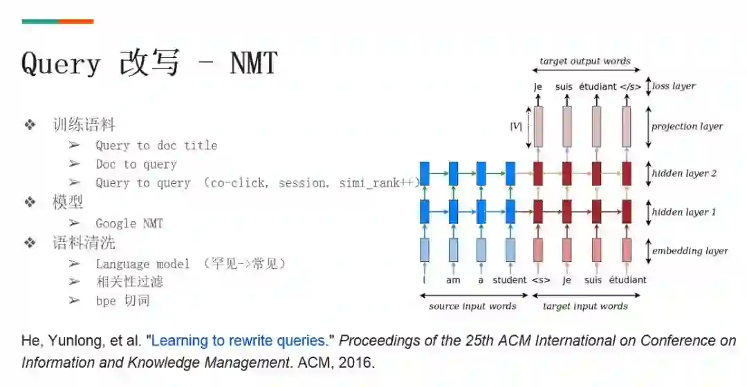 用翻译方法可以实现这个需求,即把改写问题看成 src 和 target 语言为同一种语言的翻译问题,翻译模型用的是谷歌的 NMT 结构。