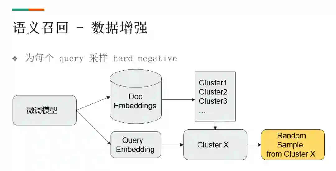 用原始的脚本数据去微调一个模型,计算 doc 的 embedding 和 query 的 embedding。对 doc embedding 进行聚类,此时 doc 和 query 的 embedding 就在同一空间里,所以 query embedding 就可以对应到某一个类别。这时候即可从 doc 里直接采样一些负样本了。