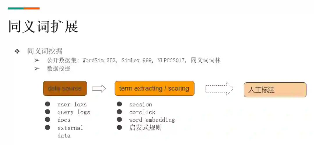 对于同义词扩展策略,首先需要一个同义词词表。现在有可以直接应用的公开数据集。但是数据集的词与知乎搜索里的词可能由于分词粒度不一致而不匹配,并且同义词无法保证更新。所以我们主要用内部语料进行数据挖掘,主要方向为:
