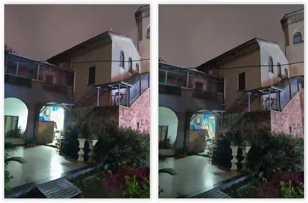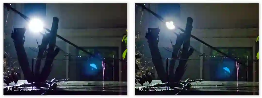 「请持稳手机」顶多算半个夜景模式,这个真夜景模式才是动真格的。可以看到,左边的「请持稳手机」把照片拍亮了,右边的「全自动」夜景模式把亮的拍到了。