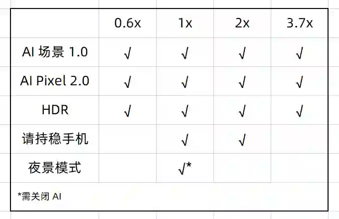 这时候你可能已经要大呼某两个字母了,先等等,看到上面那张表格的 * 号了吗?全自动夜景模式和 AI 相机无法共存。