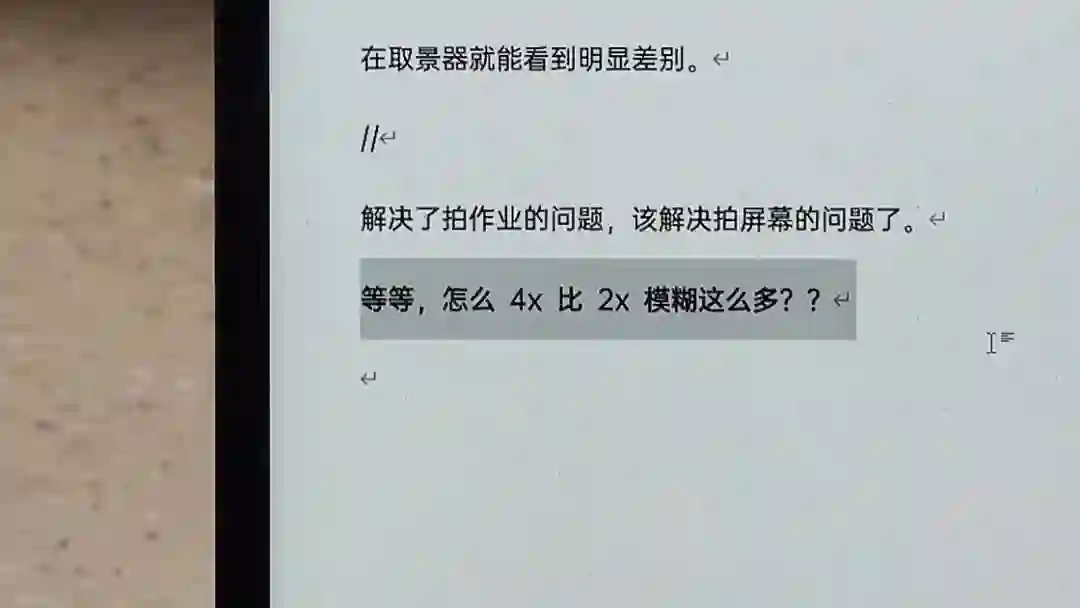 怎么回事?聪明的你应该猜到了,小米 10 Pro 在变焦时会先测距,看距离是否能达到下个镜头的最短对焦距离,达到了,就切换镜头,没达到,就继续采用主摄数码变焦。因此,当离纸张比较近的时候,用 2x 变焦也救不了边缘模糊的情况。