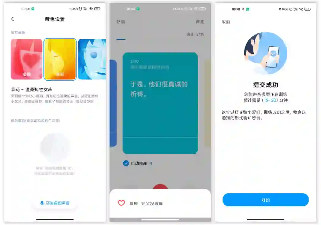 自定义音色就更厉害了,用户只需跟随引导上传 20 句《白雪公主》选段的朗读语音,经过小米服务器的机器学习,通过后就能让小爱同学使用自己的语音了,甚至还能共享语音包给其他人。只不过这个功能存在隐私问题,如果这个训练过程可以放在本地,用户可选上传分享给其他人,那就完美了。