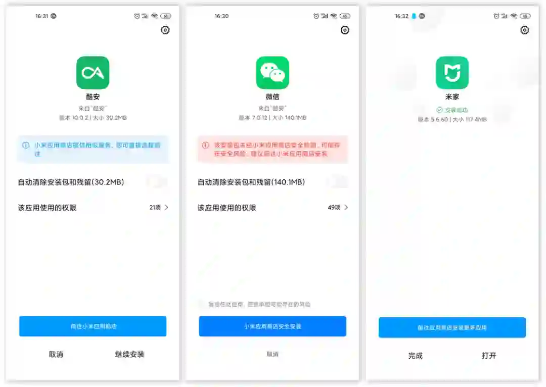 更让人恼火的是,如果不用官方应用商店改用第三方商店,在安装器中,一样能看到来自小米应用商店的推广。