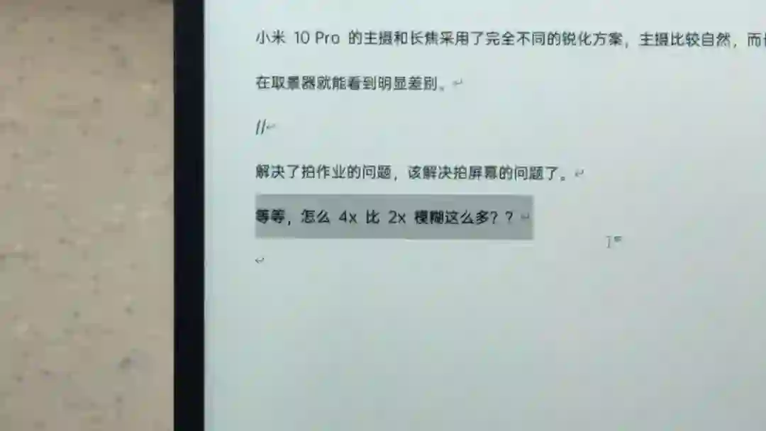 小米 10 Pro 的主摄和长焦采用了完全不同的锐化方案,主摄比较自然,而长焦锐化很重,在取景器就能看到明显差别。解决了拍作业的问题,该解决拍屏幕的问题了。
