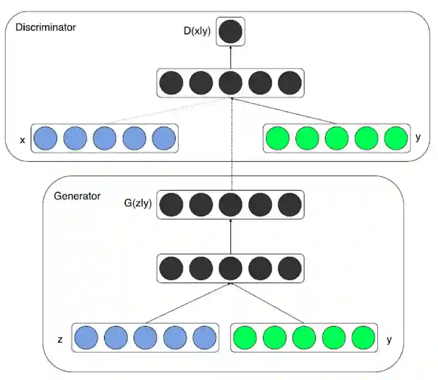 其中,y 是加入的监督信息,D(x|y) 表示在 y 的条件下判定真实数据 x,D(G(z|y)) 表示在 y 的条件下判定生成数据 G(z|y)。例如,MNIST 数据集可根据数字 label 信息,生成相应标签的图片;人脸生成数据集,可根据性别、是否微笑、年龄等信息,生成相应的人脸图片。CGAN 的架构如下图所示: