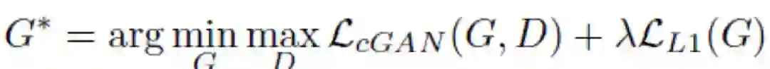 其中,x 为输入的线条图,G(x) 为生成图片,y 为线条图 x 对应渲染后的真图片,生成模型 G 用于生成图片,判断模型 D 用于判定生成图片的真假。判别网络能够最大化判断 (x,y) 的数据为真,判断 (x,G(x)) 数据为假。而生成网络使得判别网络判断 (x,G(x)) 数据为真,从而进行生成模型和判别模型的相互博弈。为了使生成模型不仅能够欺骗判别模型,还要使得生成图像要像真实图片,这样在目标函数中加入了真实图像和生成图像的 L1 距离,如下所示: