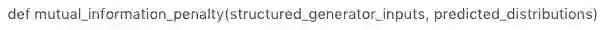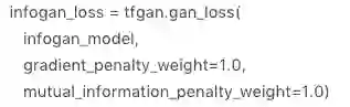 # InfoGan 的 Loss 值为在 GAN 的 loss 值上,加上互信息 I(c;G(z,c)),TFGAN 中提供了互信息计算的 API,如下所示。其中 structured_generator_inputs 为潜变量的噪音信息,predicted_distributions 为变分分布 Q(c|x)。