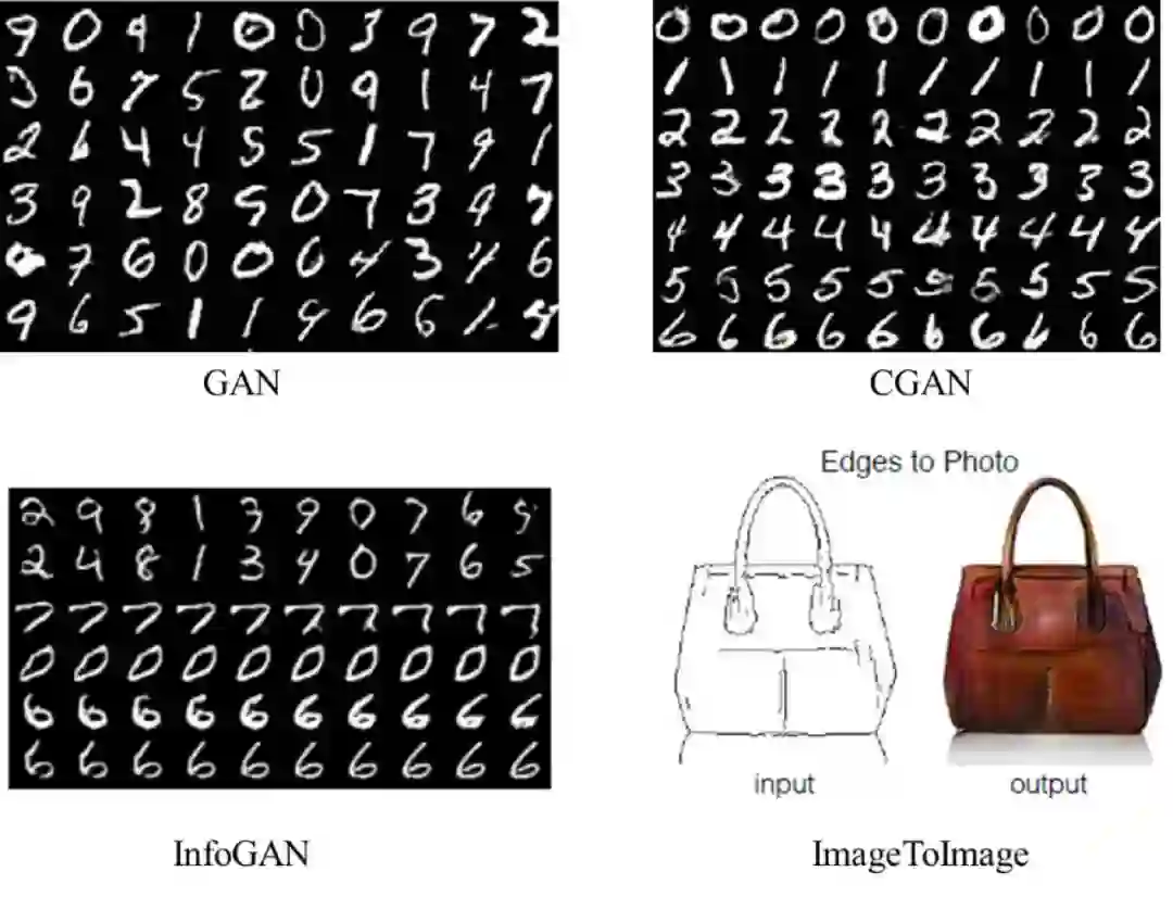 其中,原生 GAN 生成的 Mnist 图像不可控:CGAN 可按照数字标签生成相应标签的数字图像;InfoGAN 可认为是无监督的 CGAN,前两行表示用分类潜变量控制数字的生成类别,中间两行表示用连续型潜变量控制数字的粗细,最后两行表示用连续型潜变量控制数字的倾斜方向;ImageToImage 是 CGAN 的一种,实现图像的风格转换。