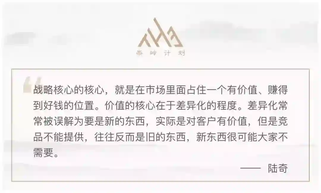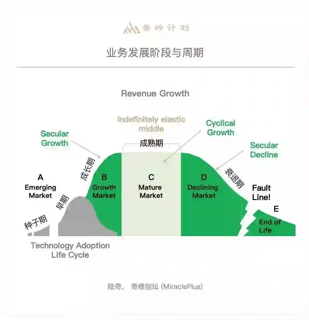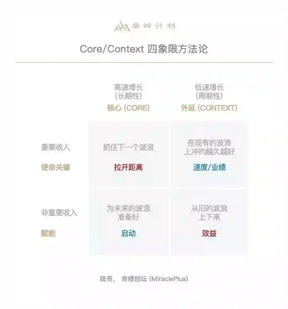 左边具有长期性,是新的S曲线,正在高速成长的业务;右边是已经成熟的、低速成长的业务。上面是重要的收入,决定企业估值,下面是非重要收入。这张图可以对应前述三个视野来看,右上、左上、左下的象限分别对应1、2、3视野,大部分的企业对左上的象限不够重视,但这是投资者最看重的地方,是支撑估值和股价的地方,也是公司的核心和使命关键。对于核心业务,一定要做差异化,衡量业绩的标准就是你与第二名的距离,不是任何其他东西。右上象限的业务,不达到预期会被惩罚,这里要做的就是按照及时完成目标,产出利润,但超出预期不加分,在这里多做营收没有意义,不要在这里花太多精力。这些在《Dealing with Darwin》这本书里讲得非常具体,基本对任何企业都适用,推荐大家阅读。最后讲一点,希望在座的每一位同学都能像盖茨一样,我认为他书写了人类历史上十分罕见的个人史,第一篇章是他创造了微软,第二篇章是盖茨基金会,去解决人类面临的最大挑战——教育、医疗、环境,希望大家有机会将你们的第一篇章做得和微软一样漂亮,第二篇章做得比他更漂亮。*「崇岭计划」由清华大学五道口金融学院和泰合资本于2018年发起,定位“新经济顶级企业家学习型组织”。