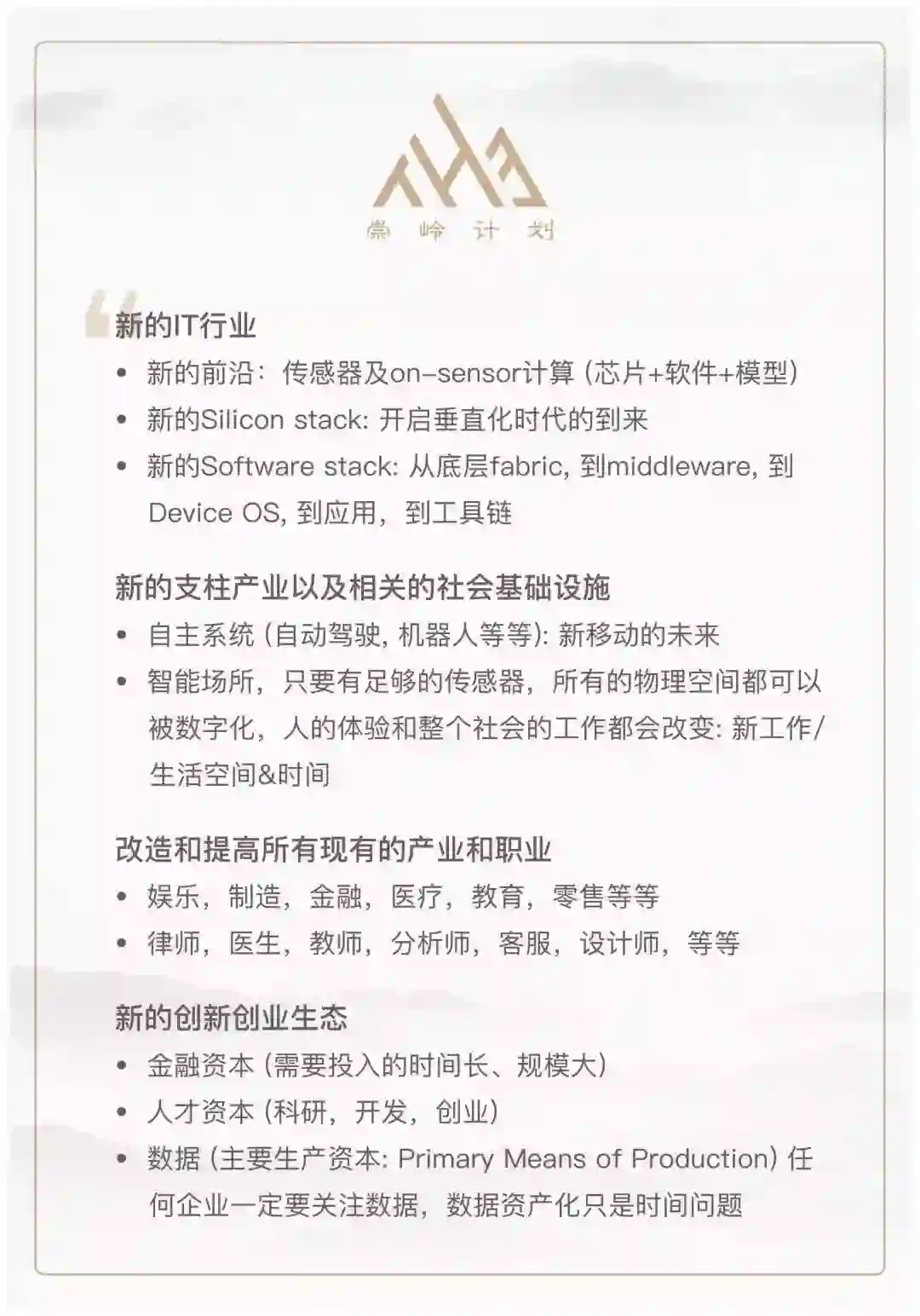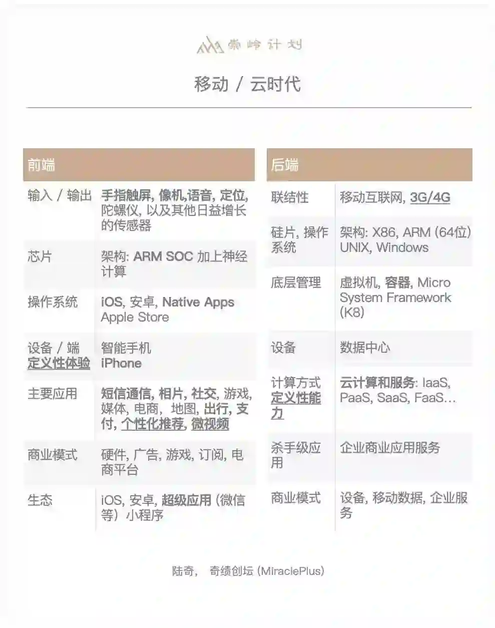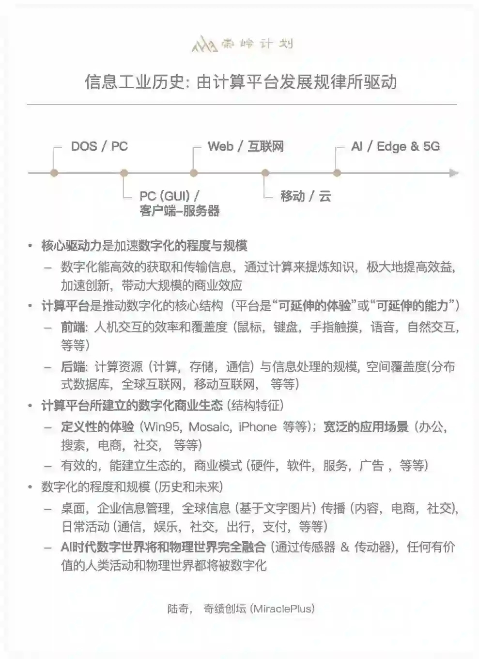 我是一个特别幸运人,在合适的时间点一线参与了多个技术平台和商业生态的开发。另外,我个人比较喜欢思考,我认为实践和思考相辅相成,两者迭代循环才能提升人的思考深度和认知水平,这里我着重推荐Richard Feynman(加州理工的物理学家)的思考方法——“what I cannot create, I do not understand.”这里他强调了“create”,就是对任何一个问题,如果不能知道如何去建立,就不能真正理解。这里的create是指把问题拆解成很多子问题,对每一个子问题的思考足够成熟之后,去给加州理工的本科生讲,如果这些本科生如果能够接受,他认为这个子问题可以成立。然后把子问题的答案组合 (create) 成为原问题的解答。 这个方法让我受益很多,具体而言,能从各个角度来能够思考一些结构化的趋势,不断地加深自己观察。