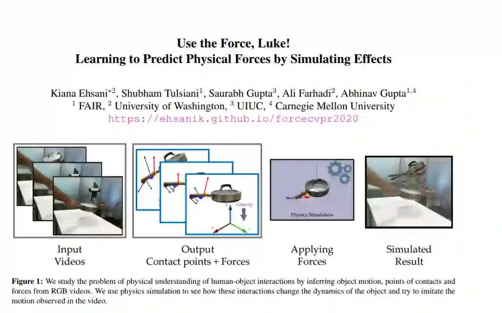 当我们人类观看人机交互的视频时,我们不仅可以推断出发生了什么,我们甚至可以提取可操作的信息并模仿这些交互。另一方面,当前的识别或几何方法缺乏动作表征的物质性。在这篇论文中,我们朝着对行为的物理理解迈出了一步。我们解决了从人类与物体互动的视频中推断接触点和物理力的问题。解决这一问题的主要挑战之一是为物理力取得真实标签。我们通过使用物理模拟器来进行监督,从而避免了这个问题。具体来说,我们使用一个模拟器来预测效果,并执行估计的力必须导致与视频中描述的相同的效果。我们定量和定性结果表明,(a)我们可以从视频中预测有意义的力,这能够导致对观察动作的准确模仿,(b)通过为接触点和力预测联合优化,我们可以在所有任务提高性能相比,和(c)我们可以从这个模型学习一个表示,泛化到使用小样本的物体上。