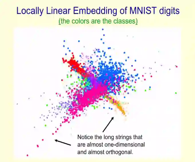 Hinton 介绍了 Sam T. Roweis 和 Lawrence K. Saul 在 2000 年 Science 论文《Nonlinear Dimensionality Reduction by Locally Linear Embedding》中提到的局部线性嵌入方法,该方法可以在二维图中显示高维数据点,并且使得非常相似的数据点彼此挨得很近。
