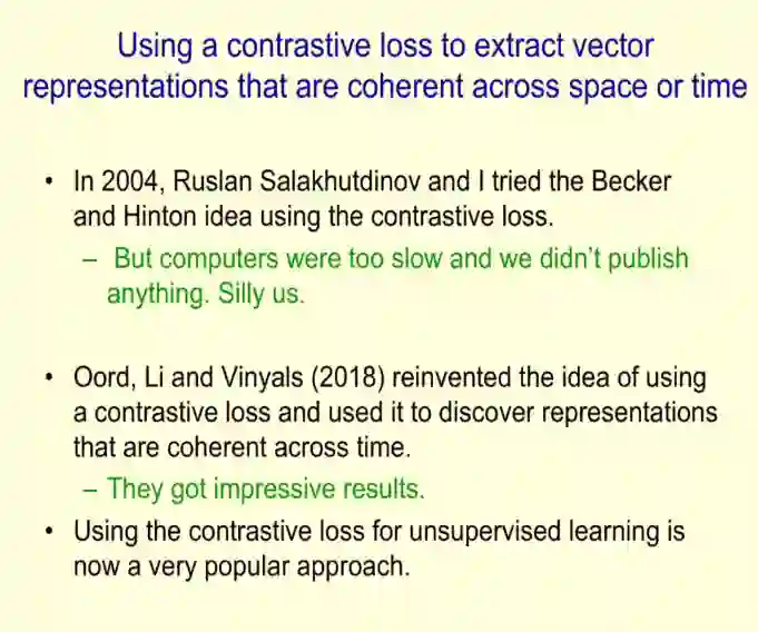 ,并介绍了他与 Ruslan Salakhutdinov 在 2004 年尝试使用对比损失的探索,以及 Oord、Li 和 Vinyals 在 2018 年使用对比损失复现这种想法,并用它发现时间一致性的表示。