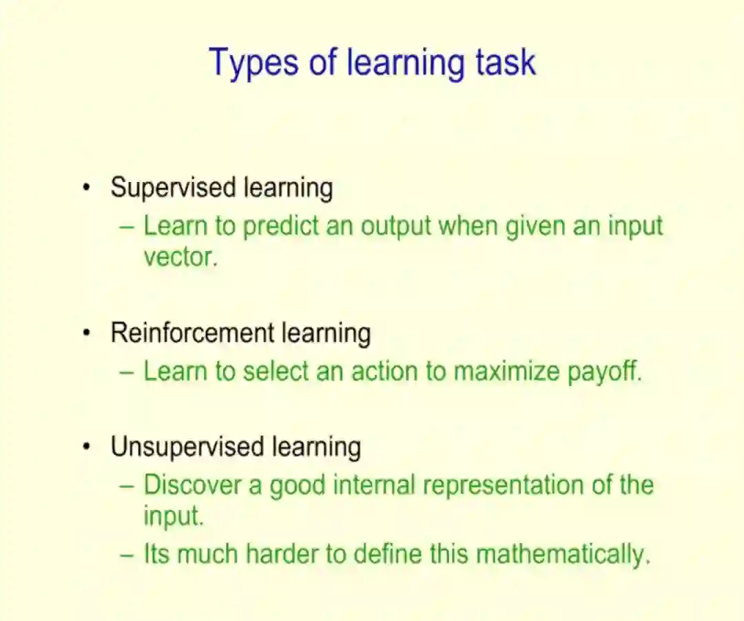 演讲一开始,Hinton 先介绍了三种学习任务:监督学习、强化学习和无监督学习,并重点介绍了无监督学习的必要性。