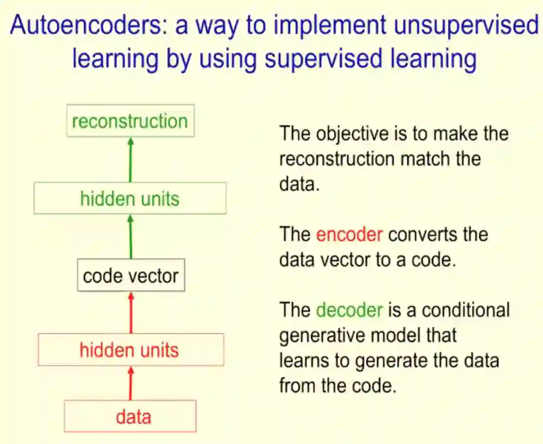 Hinton 表示,自编码器是一种利用监督学习实现无监督学习的方式,其目标是使最后的重建结果与数据相匹配。编码器将数据向量转换为代码,解码器基于代码生成数据。