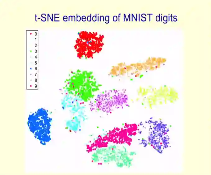 Hinton 在下图中展示了 MNIST 数据集中数字的 t-SNE 嵌入图,每种颜色代表不同的数字: