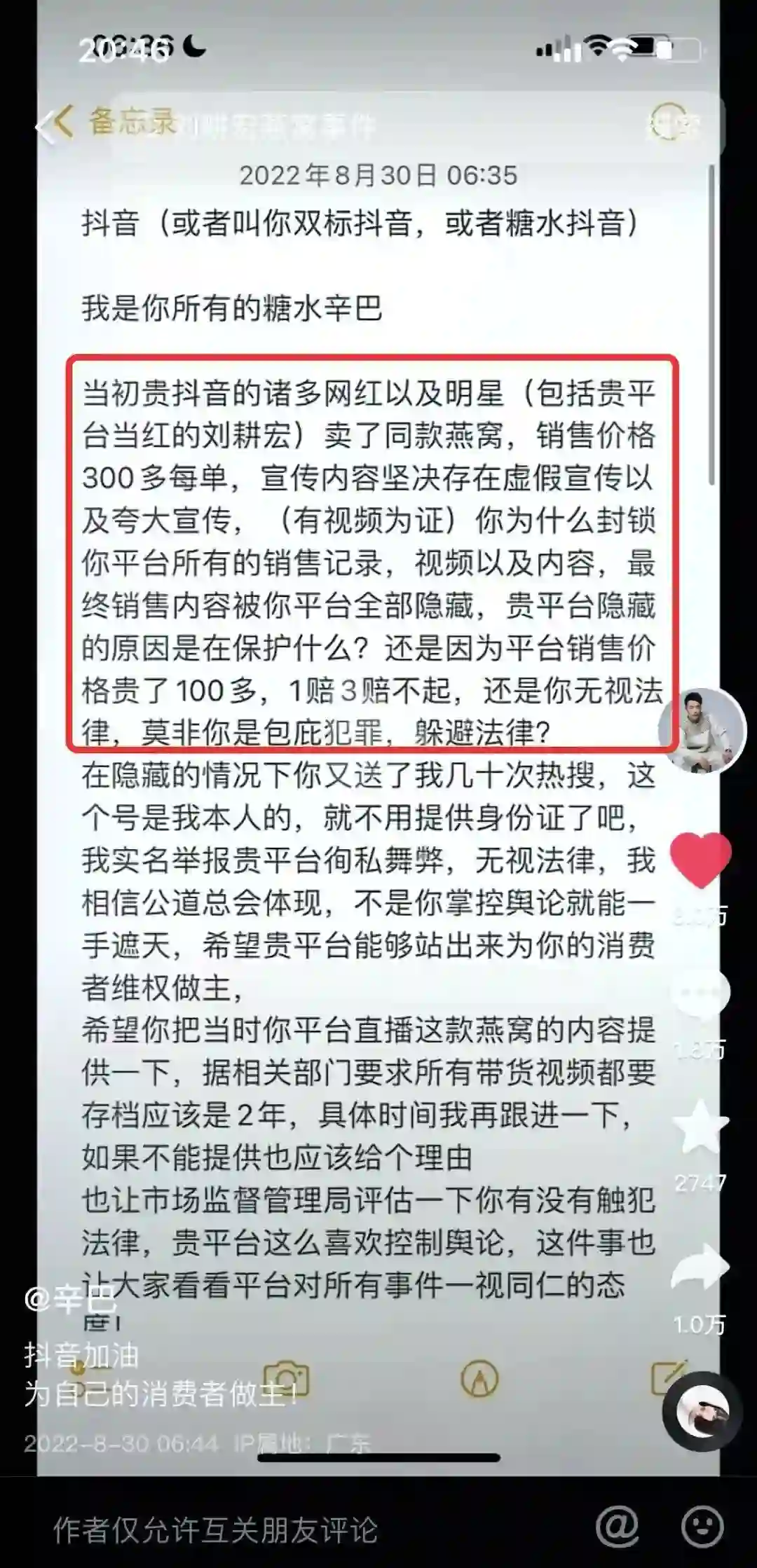 今年8月30日,辛巴在自己的抖音账号发长文,在文内提到“当初抖音诸多网红以及明星(包括贵平台当红的刘畊宏)卖了同款燕窝,销售价格300多每单,宣传内容坚决存在虚假宣传以及夸大宣传,(有视频为证)你为什么封锁你平台所有的销售记录,视频以及内容,最终销售内容被你平台全部隐藏,贵平台隐藏的原因是在保护什么?”这篇长文提到一年前热搜的事情,证明上文谈及与抖音的纠葛,当时并未解决,有一种可能是辛巴选择息事宁人。