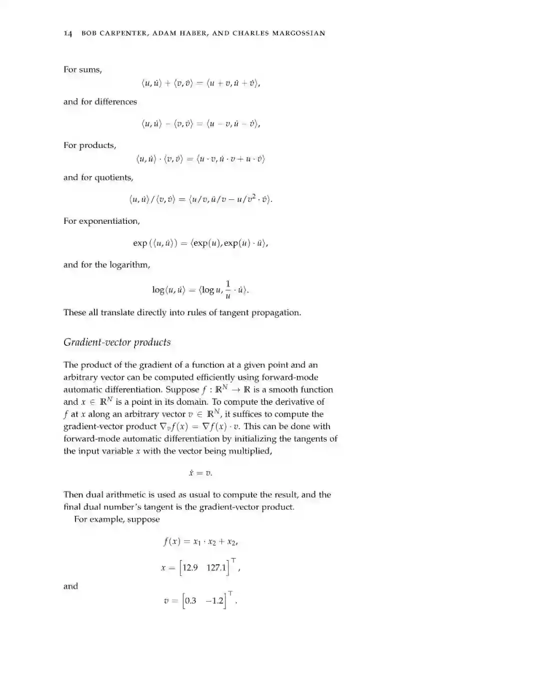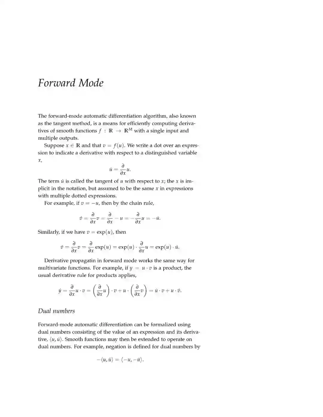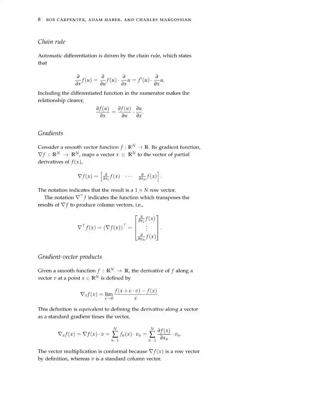 自动微分是一种通用的技术,用于将函数的计算值转换为可计算导数的值。导数计算只给用于计算函数值的每个操作增加一个常数的开销,因此可微函数与原始函数具有相同的复杂度阶数。在描述了自动微分的标准形式之后,这本书提供了一个百科全书收集的正切和伴随规则的前向模式和后向模式自动微分,涵盖了最广泛使用的标量,向量,矩阵和概率函数。附录包含正向模式、反向模式和混合模式自动区分的工作示例代码。