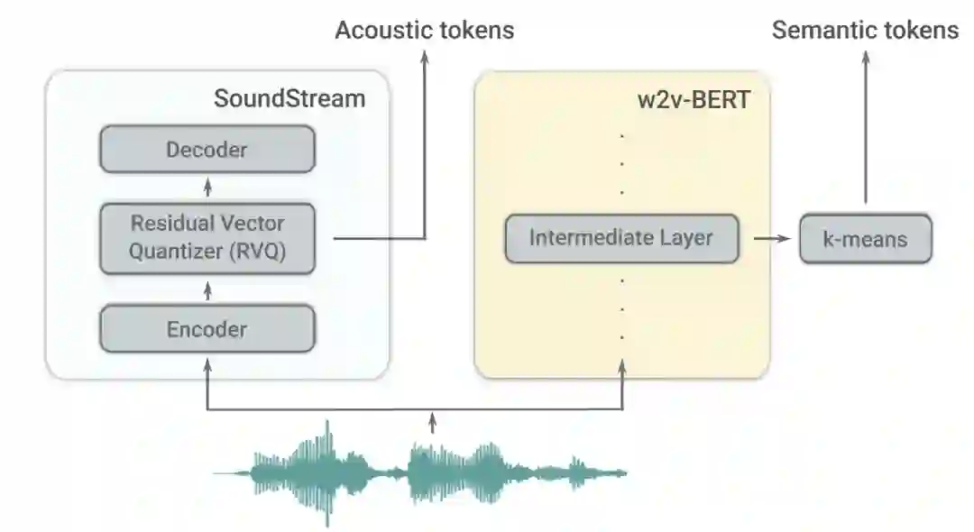首先,语义标记是从w2v-BERT这个自监督的音频模型中提取的。