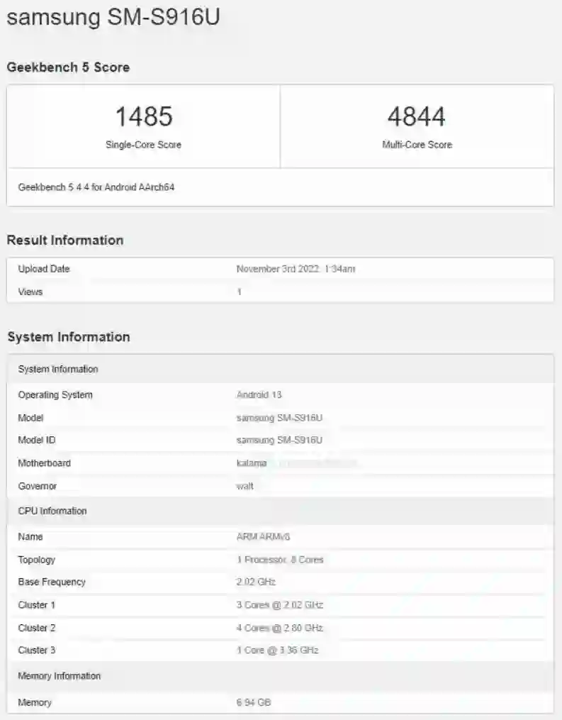 有消息称,三星目前正通过 5nm 和 4nm 节点来扩大其 Exynos 平台的市场份额,但是由于 4nm 版本良率较低,散热和性能不达标等问题,Galaxy S23 系列“被迫”采用骁龙 8 Gen2 作为主要处理器型号。前段时间,就有消息表明 Galaxy S23 现身 Geekbench 跑分网站,这也是骁龙 8 Gen 2 机型的首个跑分数据,其单核成绩为 1485 分,而多核部分得分可达 4844 分。