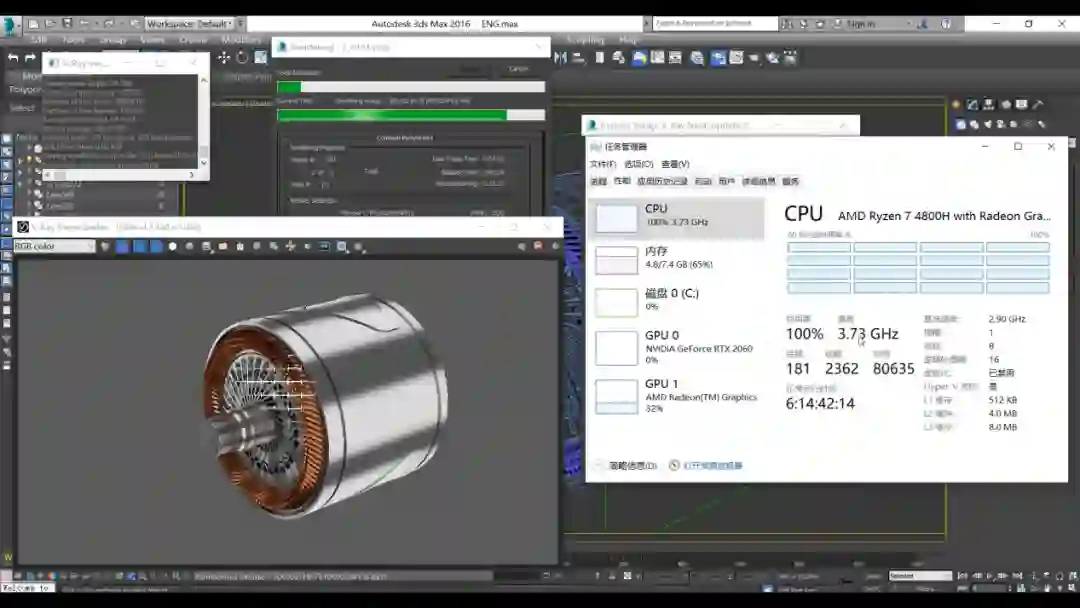 这几天我也用天选给公司一个小3D演示做了下渲染,满载全程保持在3.7Ghz左右,每一帧用时跟旁边的台式3700X比起来真的只慢了一点点,如果出差时有需要动画渲染的话,4800H确实是个非常不错的移动生产力工具。