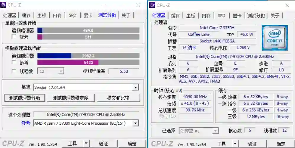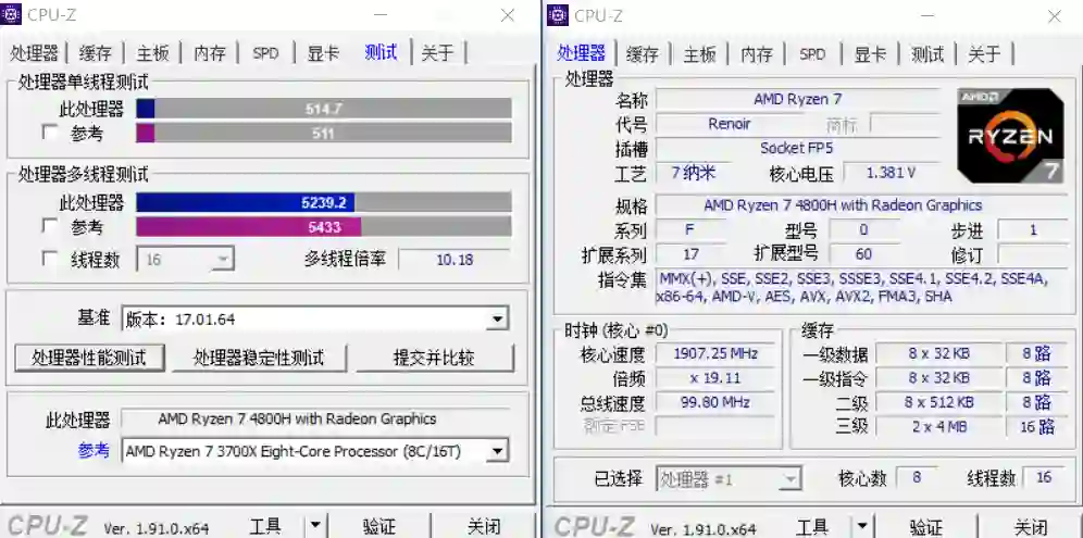 OK,看完机器,就来测下这次的主角4800H的表现,首先是CPU-Z,多核5200多分,单核514分,非常接近桌面版的3700X,我也拿了个9750H对比了下,多核得分只有4800H的56.9%,单核得分也差了11.3%。