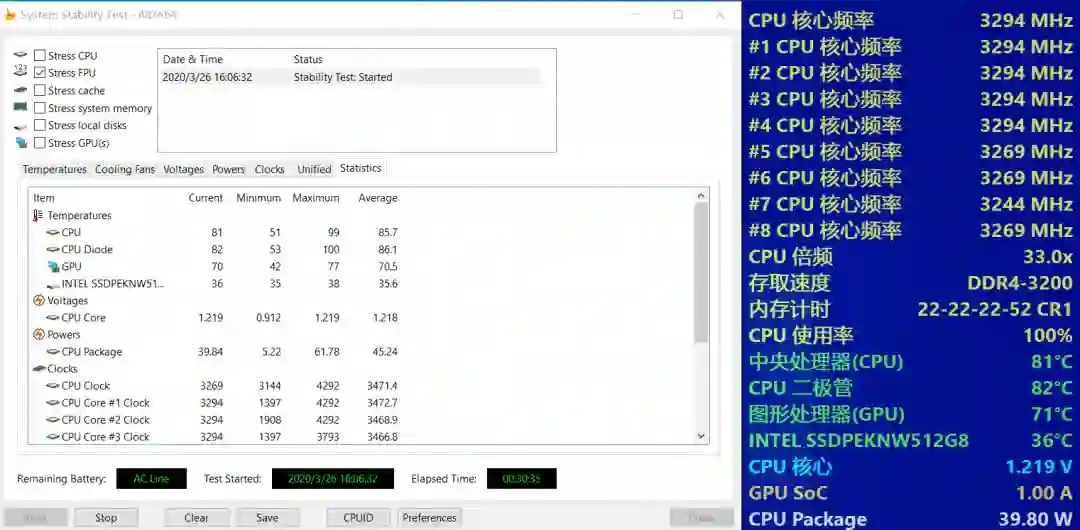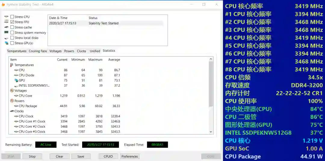 通过室温25度半小时单烤FPU,天选在增强模式下,性能释放还是比较激进的,CPU功耗最高来到61瓦,平均45瓦,核心频率维持在3.45Ghz左右,核心温度平均86.2度,就是满转速噪音比较感人,作为一个8核的标压处理器来说,这样的散热表现除了模具之外,7nm工艺的低发热也是功不可没。