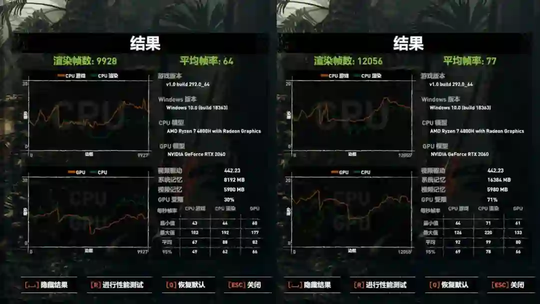 因为手里的9750H不是2060版的,所以游戏对比就用单通道内存和双通道内存做对比。