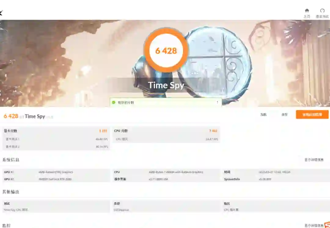 在3DMARK上,TS模式CPU分得到了7400分,6400的总分比一般2060游戏本高上不少,FS模式也一样,在CPU处理分数上拉开一大截差距。