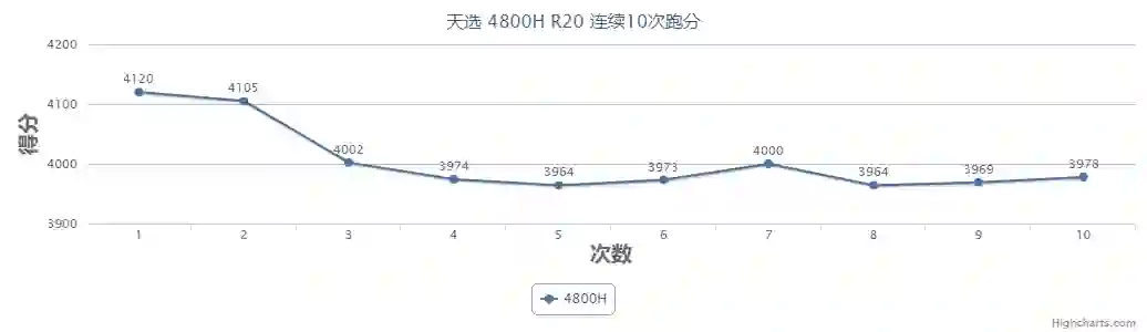 全核有55%左右的差距,单核得分也有15.4%的差距,希望下一代英特尔移动处理器加把劲吧,4800H在天选上连续10次R20分数如下,性能释放还是蛮稳定的。