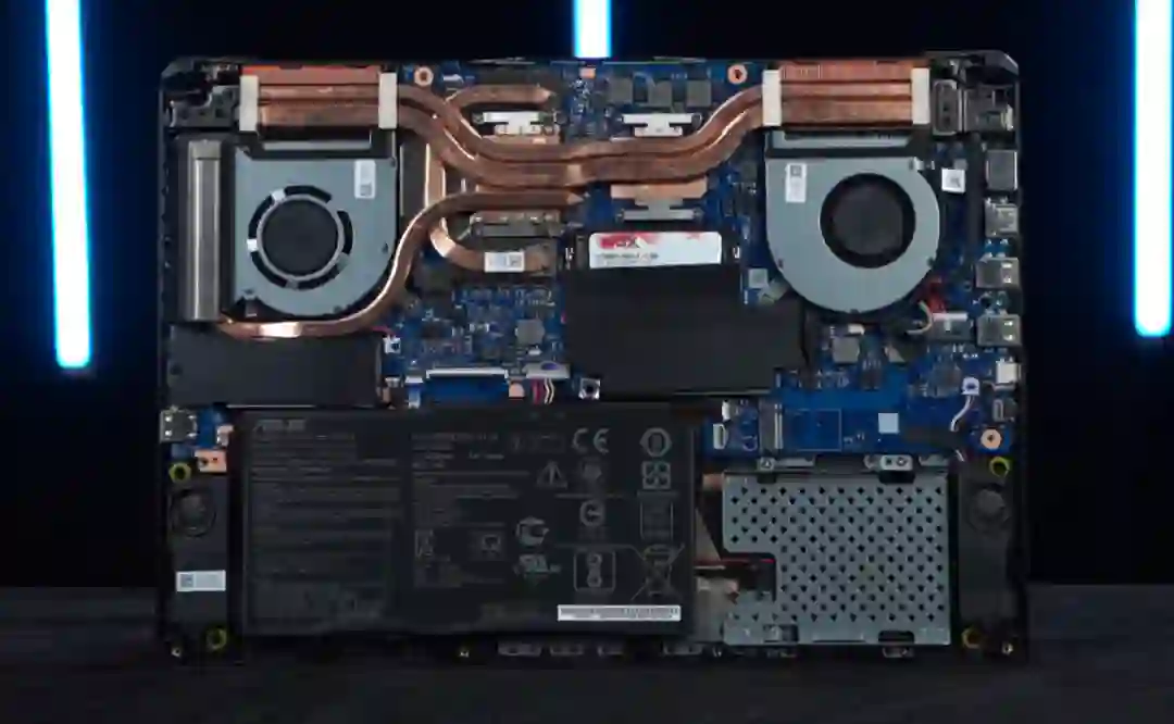 拆开D面能看到双风扇和三个出风口的冰川散热系统,但1660Ti版采用的是3散热管配置,2060用的是4热管,能省一点是一点,拓展方面两个标准笔记本内存插槽,两个M.2接口,预留了个2.5寸硬盘位,拓展性还不错,自己加个内存和固态也非常简单。