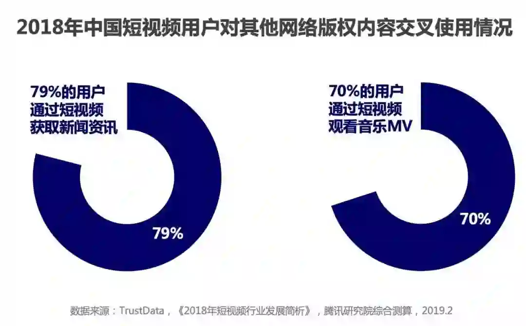 网络短视频是2018年的“黑马”,其用户规模已高达6.48亿人,市场规模达195亿。短视频的用户使用时长占比优势明显,根据QuestMobile的数据统计,短视频占移动互联网总时长比率已从2016年的1.2%快速增长到2018年的11.4%,用户使用时长优势也是其市场规模突飞猛进的关键所在。另外,网络短视频与其他网络版权业态不断融合,共振效应越发显著。据TrustDate数据统计,因短视频的碎片化属性和强烈临场感,79%的互联网用户会通过短视频获得新闻资讯,70%的用户会通过短视频观看音乐MV。