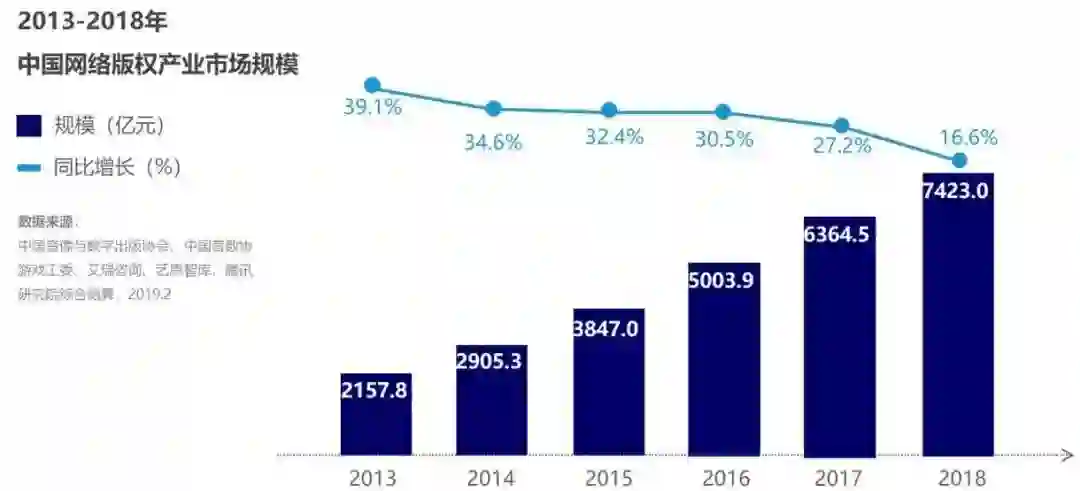 2018年中国网络版权产业市场规模达7423亿元,同比增长16.6%。数据分析显示,2006年至今,中国网络版权产业连续十余年保持高速增长态势,已经崛起成为推动我国版权产业振兴的核心支柱,以及驱动我国数字经济发展的重要引擎,并在全球网络版权产业格局中取得了举足轻重的地位。