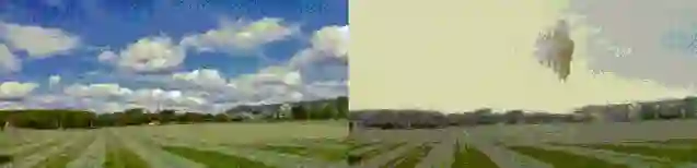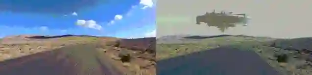 荒野、公路、疾驰的汽车,还有天边的巨型神秘建筑物,有科幻 / 末世电影内味儿了。然而,这幅场景竟然是从晴空万里的画面转换而成的。公路片变身科幻片?!
