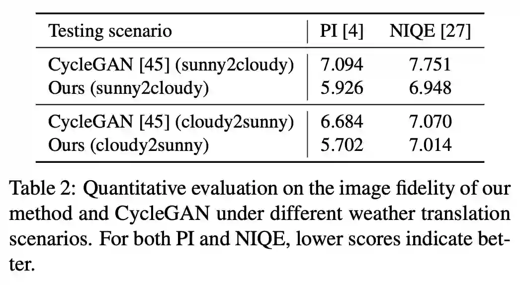 下表 2 给出了在不同天气转换场景下这两种方法的图像保真度定量对比结果。该研究提出的方法在两个定量度量指标和视觉质量上均显著优于 CycleGAN。