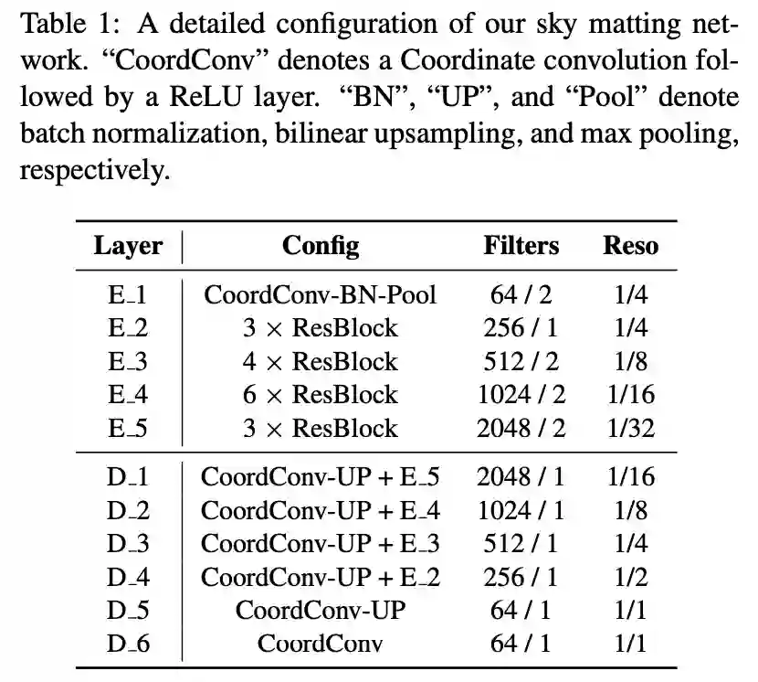 该方法使用 ResNet-50 作为天空抠图网络的编码器(全连接层被移除)。解码器部分包括 5 个卷积上采样层(coordinate 卷积 + relu + 双线性上采样)和一个像素级预测层(coordinate + sigmoid)。该研究方法遵循 UNet [30] 的配置,并在具有相同空间大小的编码器层与解码器层之间添加残差连接。表 1 显示了该网络的详细配置:
