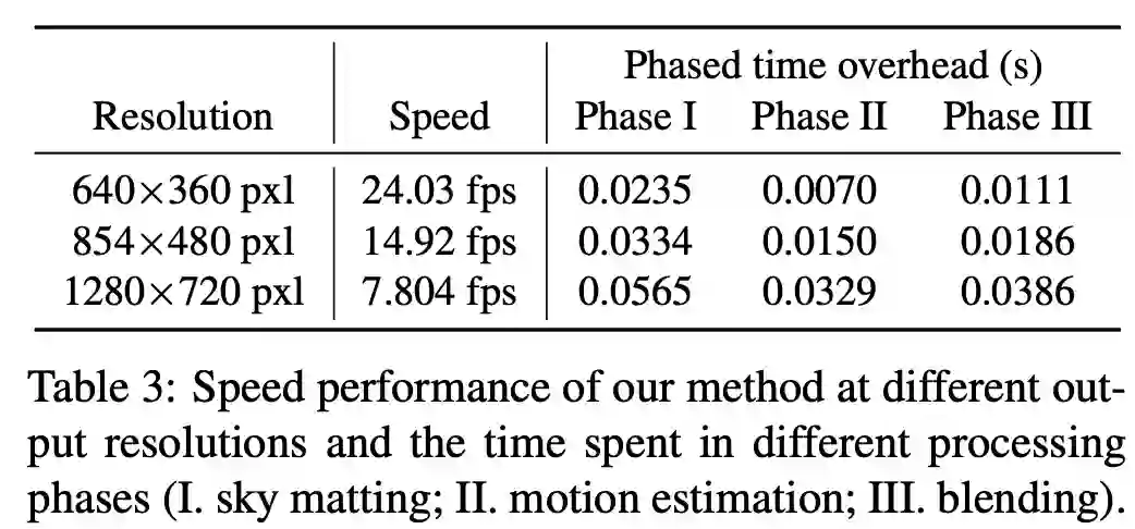研究人员将这个艺术加工过程分解成 3 个任务:天空抠图(sky matting)、运动估计和图像融合,并在智能手机和行车记录仪在户外采集到的视频上进行了实验,结果表明该方法在视觉质量以及光照、动态方面均具有高保真度和不错的泛化性。