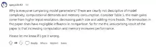 为什么每个人都在比较模型参数?这些显然不能描述模型的复杂性、计算需求和内存消耗。例如表5,主要收益来自更高的输入分辨率,减少补丁大小和增加更多的头。相比之下,本文的创新之处影响不大。所以对我来说,这篇论文的结果并不令人惊讶,那就是计算和内存的增加提高了性能。