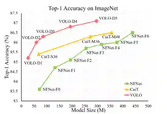 实验表明,VOLO 在没有使用任何额外训练数据的情况下,达到了87.1% 的top1精度 ImageNet-1K 分类,是第一个在这个竞争性基准上超过87% 精度的模型。