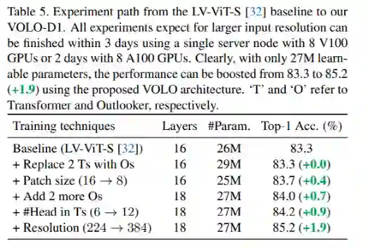 从LV-ViT-S[32]基线到我们的VOLO-D1。所有的实验都期望更高的输入分辨率,并且在3天内使用带有8 V100的单个GPU服务器节点2天8 A100 GPU完成训练。显然,文中提出的VOLO架构只有2700万个可学习参数,性能就可以从83.3提高到85.2(+1.9)。“T”和“O”指分别是Transformer和Outlooker。