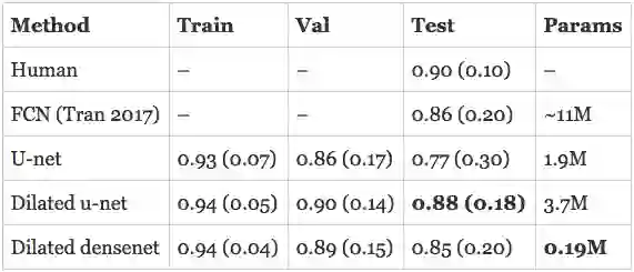 扩张DenseNet表现不错,在验证集上得到了0.87(0.15)的戴斯得分,训练精度为0.91(0.10),同时保持了极高的参数效率!
