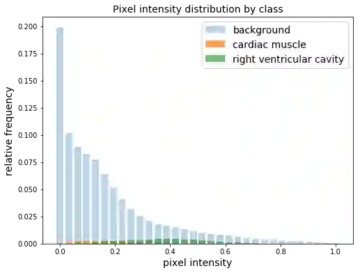 由于大多数像素都属于背景,所以各个种类之间分布不平衡。如果将像素强度归一化在0和1之间,那么在整个数据集中,只有5%的像素属于RV腔的一部分。