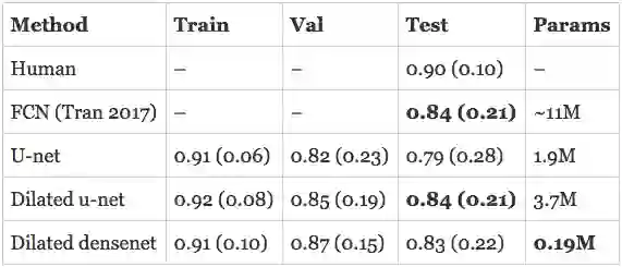 扩张u-net与心内膜上的最新技术水平相当,并超过它在心外膜上的表现。扩张DenseNet紧跟其后,仅有190K个参数。