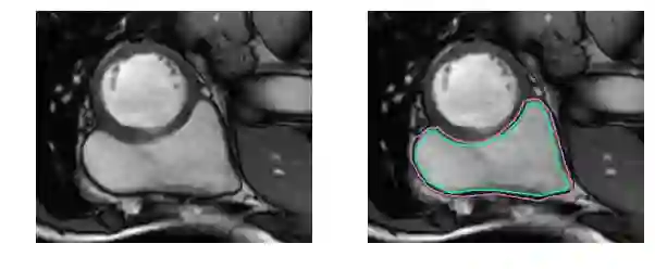 撇开医学术语不谈,要识别RV就更困难了。左心室是一个厚壁圆环,而右心室是一个形状不规则的物体,有薄的壁,有时会与周围的组织混合在一起。这是MRI快照右心室内壁和外壁(心内膜和心外膜)的手工绘制轮廓: